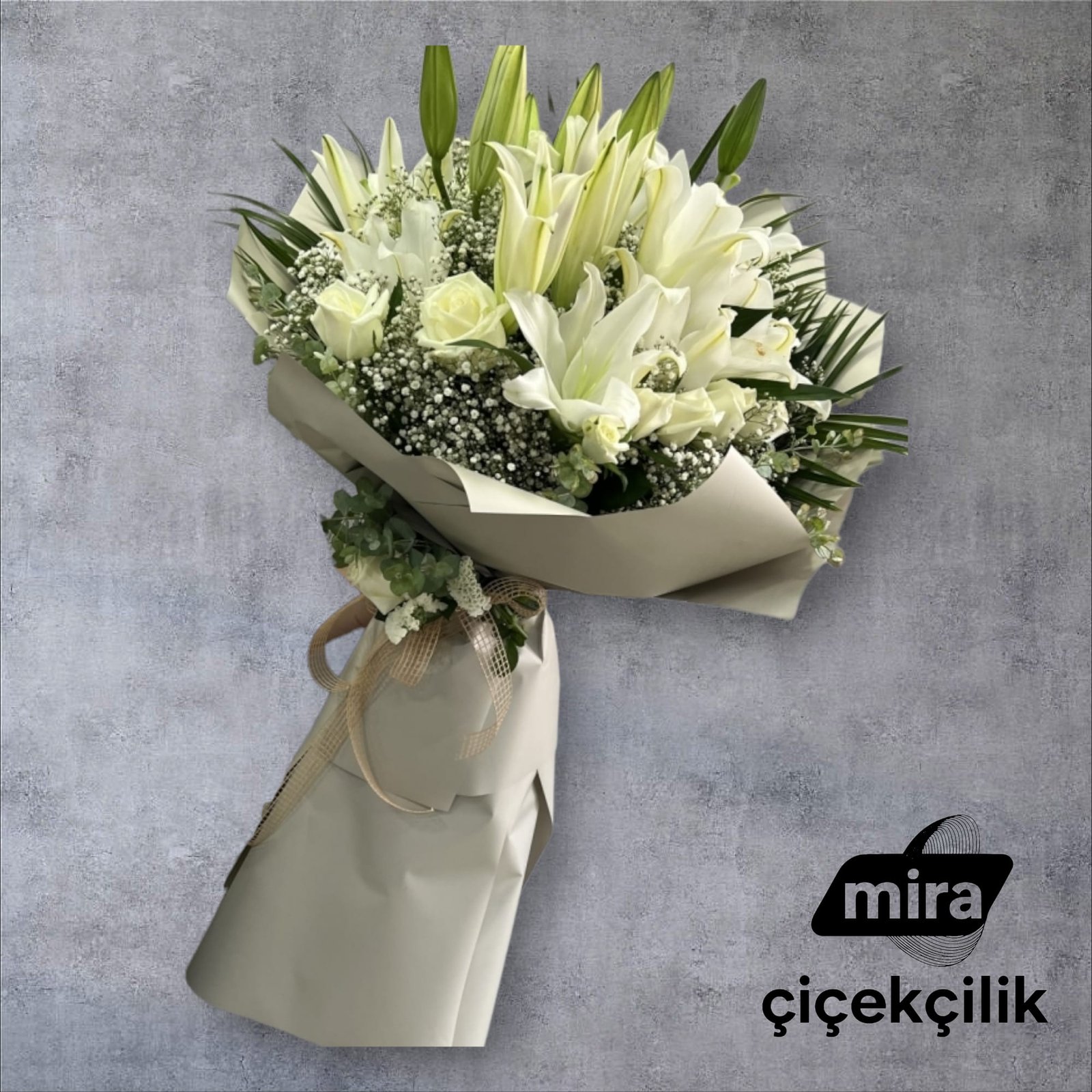 Beyaz lilyumların asil duruşu ve beyaz güllerin zarif dokunuşuyla hazırlanan bu özel buket, sadeliğin en şık halini yansıtır. Özenle seçilmiş taze çiçekler ve doğal yeşilliklerle tamamlanan aranjman, modern ambalajı sayesinde göz alıcı bir sunum sağlar.