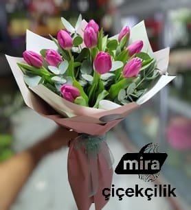 11 Adet mor Lale ve Yeşillikler ile